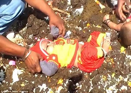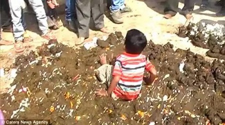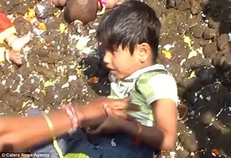 Inhabitants of the tiny village of Betul in Madhya Pradesh have a really bizarre custom dating back centuries. They dip their children in cow dung in the belief that the 'purity' of the cow dung will bring their children luck and protect them from disease.